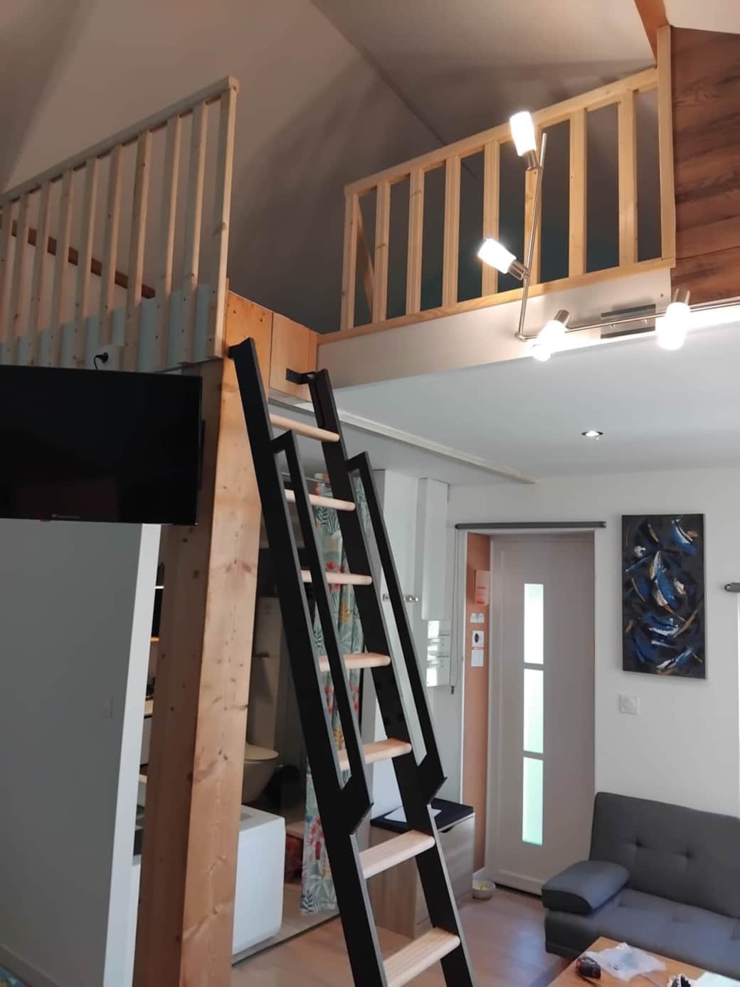 La mezzanine est sécurisée par un portillon et accueille deux couchages (90 × 180), régulièrement utilisés par des jeunes adultes ou accompagnants.